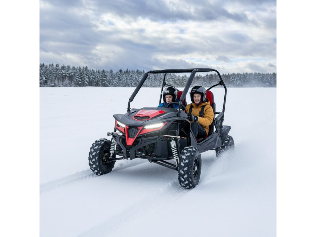 Perfektní svezení pro děti, juniory a lehčí dospělé osoby. Lepší ochranu zajišťuje ocelový rám a sedadla s bezpečnostními pásy. Velká průjezdnost terénem, komfortní odpružení. Elektrický i ruční startér.
