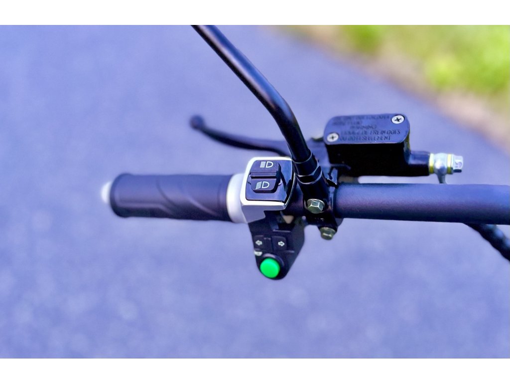 V ceně zrcátka a zadní opěrku, která se v mnohých případech připlácí. Krásně zpracované blinkry ve stylu Audi. Displej ukazuje blinkry, stav baterie, rychlost, počet kilometrů. Alarm a klakson je je již v ceně. Dálkovým ovládáním je možné koloběžku zamknout/odemknout na dálku. LED osvětlení je montováno v blinkrech, zadním světle, brzdovém světle, v předním a dálkovém světle. Výhodou je dlouhá životnost osvětlení a malá spotřeba baterie. V ceně je také samozřejmě baterie a nabíječka.