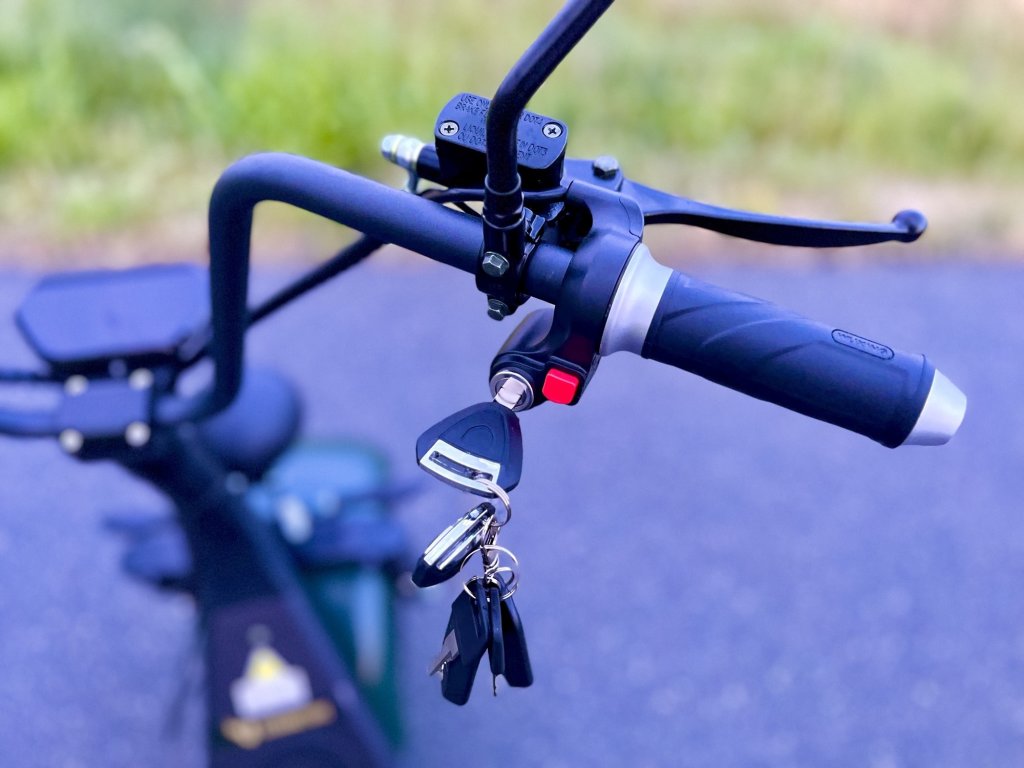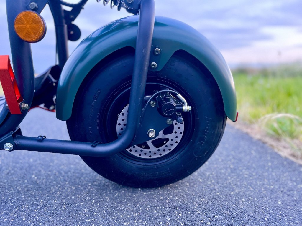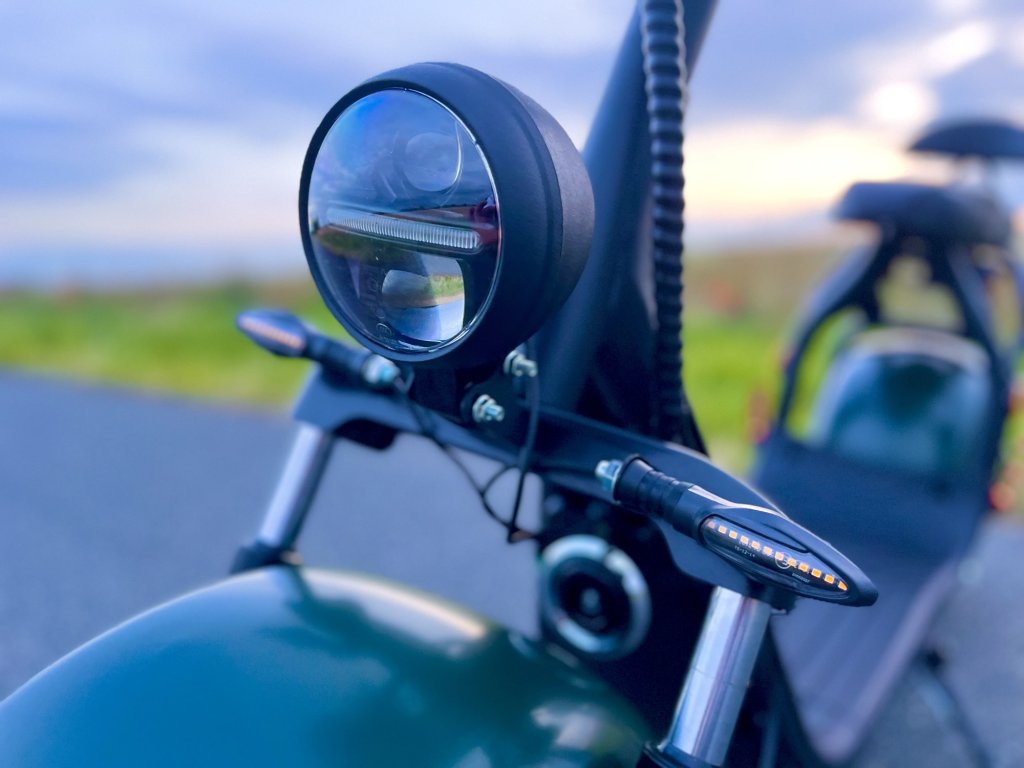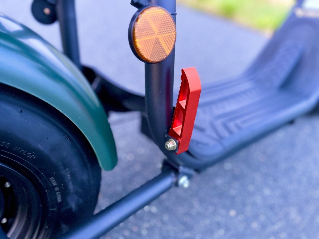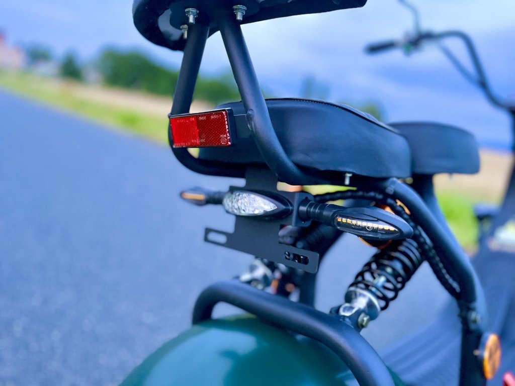 V ceně zrcátka a zadní opěrku, která se v mnohých případech připlácí. Krásně zpracované blinkry ve stylu Audi. Displej ukazuje blinkry, stav baterie, rychlost, počet kilometrů. Alarm a klakson je je již v ceně. Dálkovým ovládáním je možné koloběžku zamknout/odemknout na dálku. LED osvětlení je montováno v blinkrech, zadním světle, brzdovém světle, v předním a dálkovém světle. Výhodou je dlouhá životnost osvětlení a malá spotřeba baterie. V ceně je také samozřejmě baterie a nabíječka.
