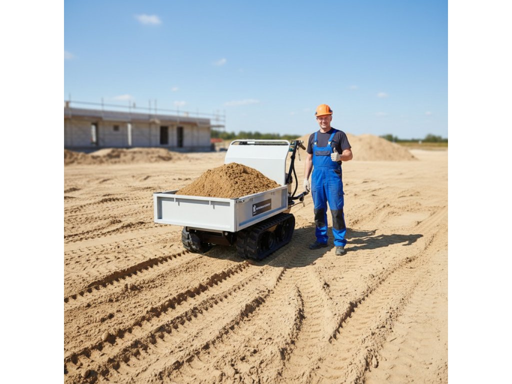 Díky silnému motoru DUCAR 209 cc a nosnosti až 300 kg zvládne tento dumper bez problémů přepravit písek, hlínu, kamení i další stavební materiál. Robustní pásový podvozek se šířkou pásů 180 mm zajišťuje vynikající stabilitu a přilnavost i na měkkém či kluzkém povrchu, jako je bláto, sníh nebo štěrk. S kompaktní šířkou stroje snadno projede i úzkými prostory, dveřmi nebo zahradními vrátky, takže se uplatní i tam, kde jiné stroje selhávají.