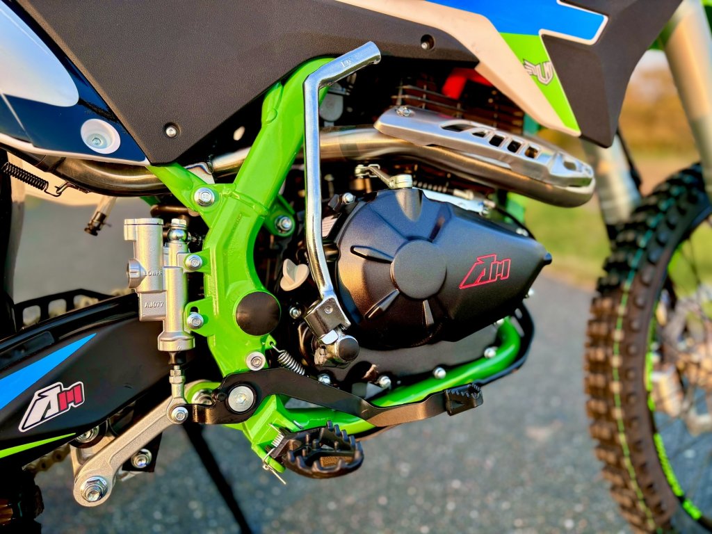 Motor je chlazený vzduchem, což udržuje optimální teplotu i při vysoké zátěži. Pětistupňová manuální převodovka (1-N-2-3-4-5) vám umožní perfektně přizpůsobit výkon podmínkám terénu, ať už jedete rychle po rovných úsecích, nebo manévrujete v technických pasážích. Pitbike je vybaven jak elektrickým startérem, tak nožním startem, takže se nemusíte obávat, že by vás v terénu zradil.